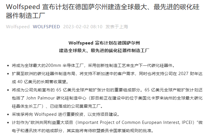 如今,这一消息得到了Wolfspeed的证实。当地时间2月2日,Wolfspeed在其官网宣布,计划在德国萨尔州建设世界上最大、最先进的碳化硅器件制造工厂,以支持对各种汽车、工业和能源应用不断增长的需求。