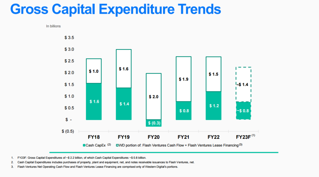 此前1月西部数据预计2023财年总的资本支出将为23亿美元,其中包括工厂、设备在内的现金资本支出约9亿美元。