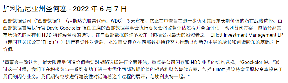 Elliott管理合伙人Jesse Cohn和高级投资组合经理Jason Genrich表示,Elliott准备提供战略资源和额外的资本来帮助西部数据实现其两项业务的全部价值。